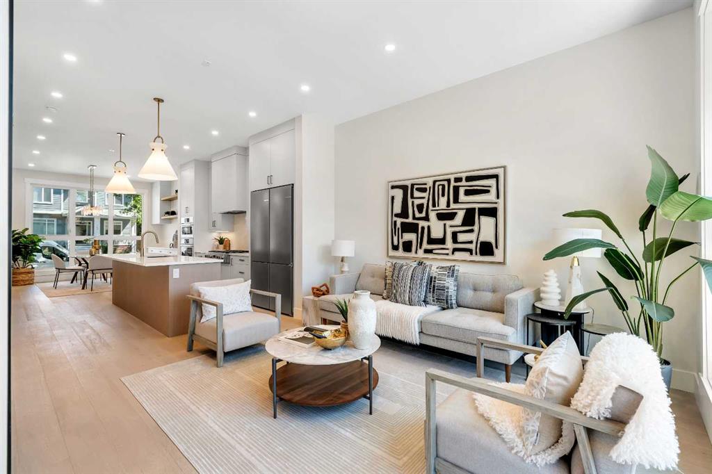 The main floor opens with a welcoming front foyer and a bright dining area positioned at the front of the home, perfect for cozy dinners or entertaining guests. The designer kitchen sits at the center, anchoring the space with a large island, quartz countertops, a built-in pantry, and a premium appliance package that includes a gas cooktop and a French door fridge/freezer. At the rear, the living room feels like a retreat, complete with a sleek fireplace, large windows, and easy access to the back deck and a double detached garage. A designer powder room is privately tucked away off the mudroom, and the built-ins here add everyday convenience without compromising on style.