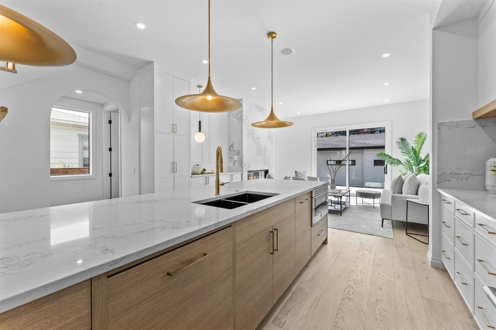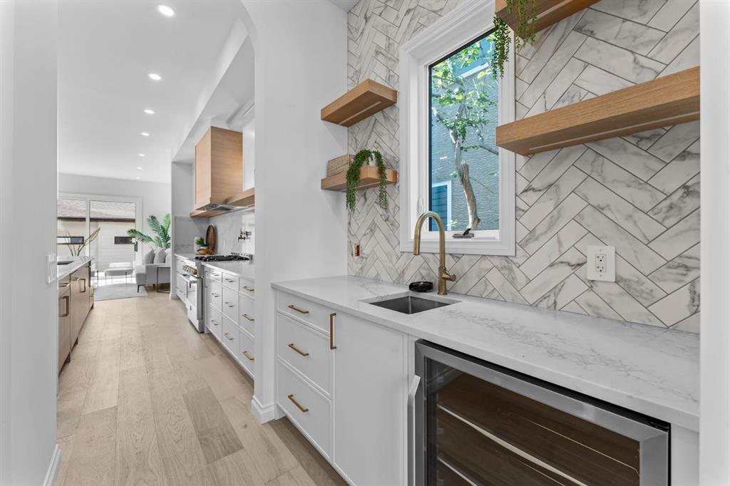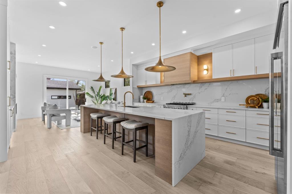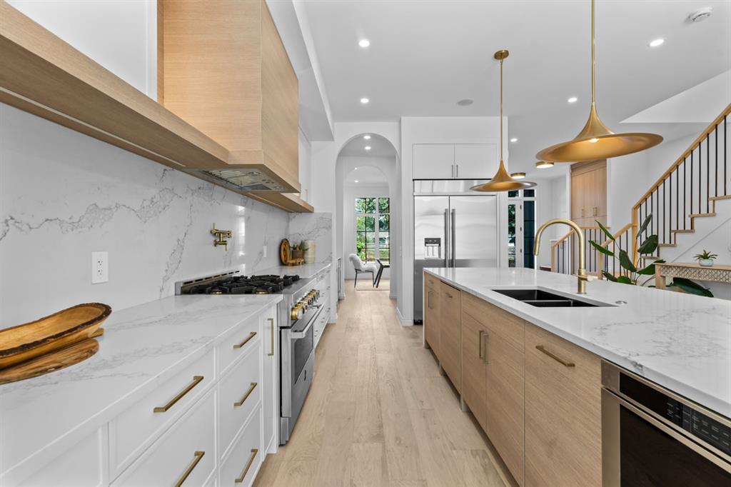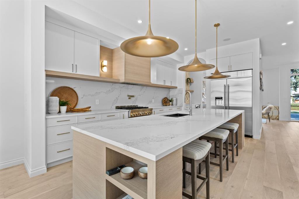 Move into your new ULTRA-LUXURY, DETACHED INFILL today! Expertly designed and crafted by AG Developments, this one-of-a-kind home is located on a quiet street in sought-after INGLEWOOD! Steps from the Inglewood Aquatic Centre, Good News Coffee, Mills Park Playground, the Bow River Pathway system, and just a block away from 9th Ave, you’re in a dream location that will perfectly match your family’s lifestyle! The highly desirable location is only improved upon by this home’s fantastic layout, with room for all the kids plus some. The curb appeal, highlighted by the welcoming and timeless RED BRICK exterior, welcomes you into an impressive foyer with a built-in bench and custom-built cabinetry and closets under a stylish panelled wall with direct access to the front dining room with designer light and more custom cabinetry and wall moulding. 10-ft ceilings and wide plank-engineered hardwood flooring span the entire level into the spacious shared kitchen and family room area, with a convenient walkthrough BUTLER’S PANTRY into the dining room. The luxury kitchen offers you tons of space for hosting holiday dinners and making memories, with an oversized central island with an endless quartz countertop, a dual basin undermount sink, full-height cabinetry, a full-height quartz backsplash, pot filler, tons of lower drawers, and that lovely walk-through pantry w/ prep sink, beverage fridge, display shelving, plus a WALK-IN PANTRY! The family room blends seamlessly with the open-concept kitchen with custom millwork, designer lighting, & a stunning inset gas fireplace with ceiling-height honed quartz surround. A rear mudroom with a built-in closet and bench takes you outside to the detached 28×22 GARAGE, while an elegant powder room finishes off the main floor. LED lit wood-wrapped stairs lead you upstairs and to the upscale primary suite featuring a high vaulted ceiling, a massive walk-in closet with B/I shelving & lighting , an incredible 5-pc ensuite w/ designer tile, an elegant soaker tub, a fully tiled STEAM SHOWER with a bench, dual vanity w/ quartz counter, lower drawers, LED backlighting, heated tile floors, and a private water closet. The two secondary bedrooms are both JR SUITES with recessed ceilings, walk-in closets, and modern 4-pc ENSUITES. Finishing off the upper floor is the good-sized laundry room w/ a sink, quartz counter, and tile floor. Downstairs, the living space seems endless with a dedicated and spacious home gym, a fourth bedroom, AND a private home office space! That’s alongside the massive rec area with a full wet bar, perfect for everyday use! Another 3-pc contemporary bathroom finishes off this level. Other highlights of this incredible home include rough-ins for A/C and in-floor heat in the basement. This home and location are ideal for any family looking to settle into the ultimate inner-city lifestyle! With designer finishes and upgrades like this, you don’t want to wait to talk with us about making this home your dream home!