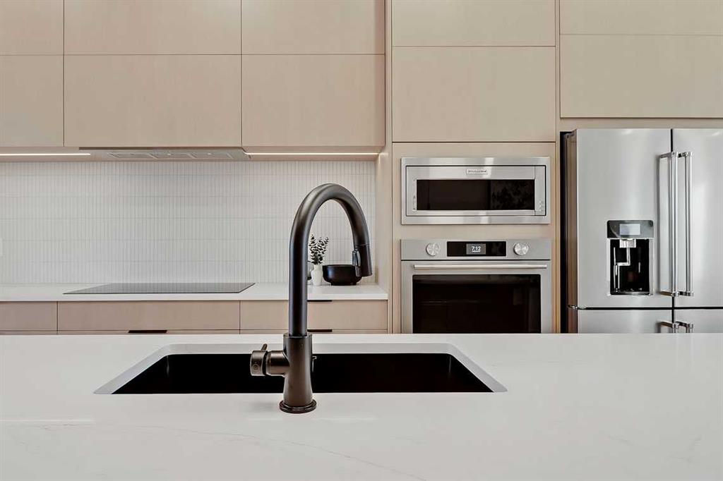 The living room is anchored by a sleek fireplace and flows effortlessly into the kitchen — a space designed as beautifully as it performs. Quartz countertops, full-height custom cabinetry, a built-in pantry & coffee station, and stainless steel appliances offer both style and functionality. The oversized island invites gathering & connection.
