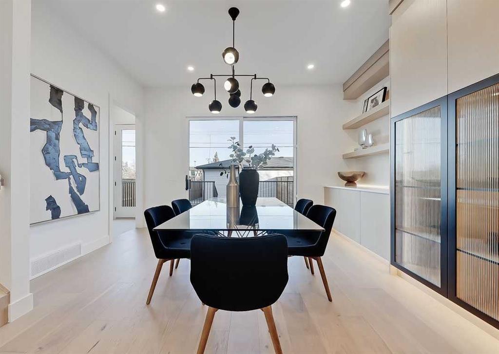 The dining area is a standout architectural feature, complete with a built-in decorative buffet showcasing full-length shelving with integrated lighting & elegant fluted glass cabinetry. This thoughtfully designed focal point adds warmth, texture, and curated display space while enhancing the home’s cohesive Scandinavian aesthetic. Expansive sliding doors open from the dining space, seamlessly extending the living area onto the rear deck and backyard — creating effortless indoor-outdoor flow ideal for entertaining and everyday living.