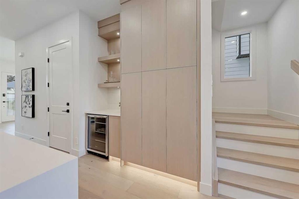 Step inside to a bright, airy foyer where clean millwork and a built-in bench create an organized and understated welcome. A discreet, hidden door conceals the powder room, maintaining the seamless, minimalist aesthetic that defines the main floor. The open-concept layout is enhanced by 10-foot ceilings, oversized windows, and warm natural finishes that reflect Scandinavian simplicity while mid-century inspired lighting and architectural detailing add depth and character.