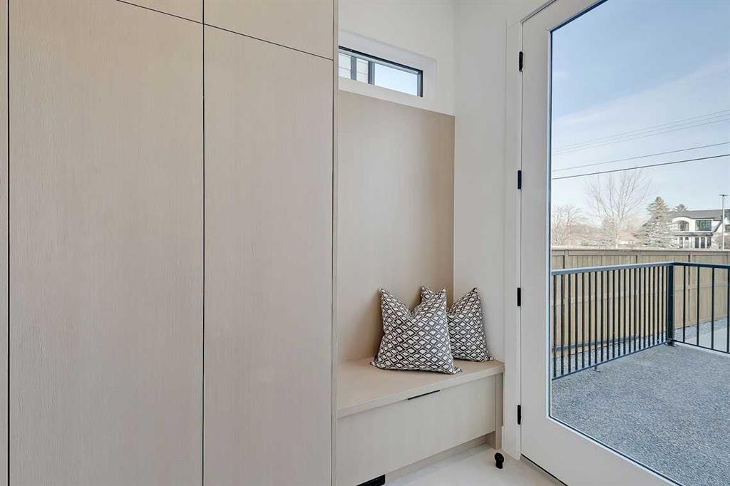 At the back of the home, a mudroom with sleek built-in storage & bench seating adds everyday convenience without compromising the streamlined design.