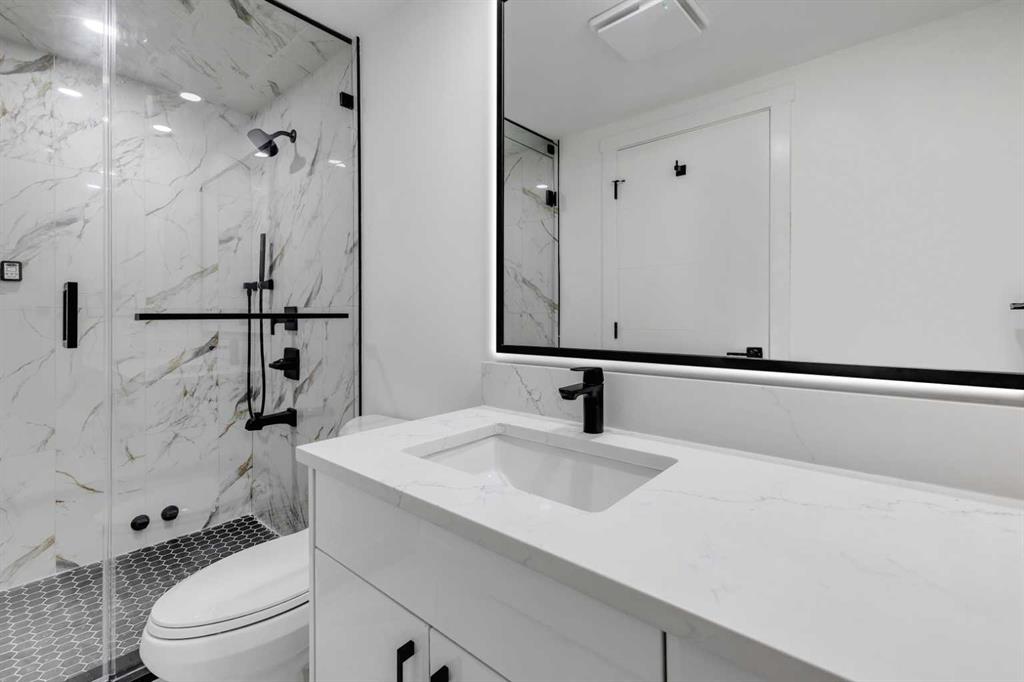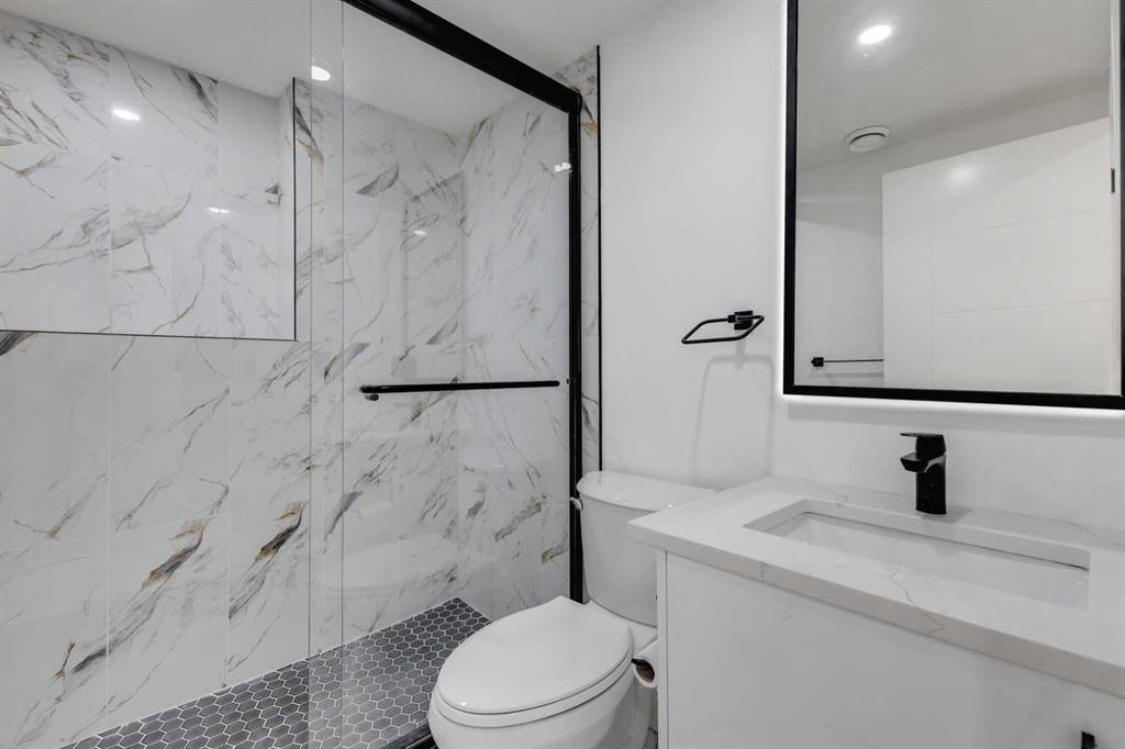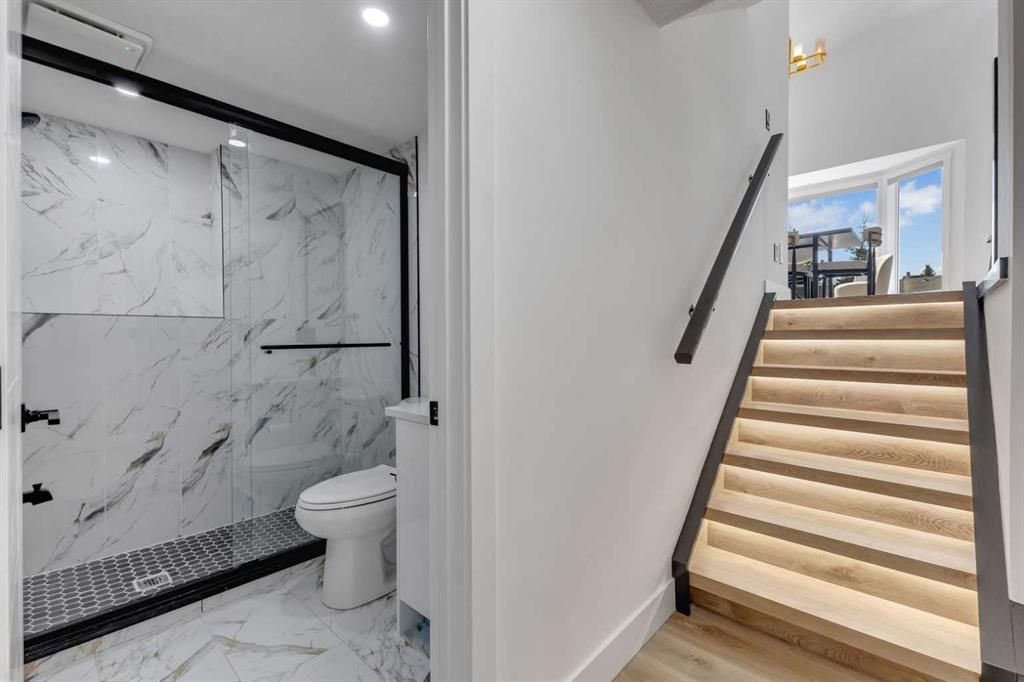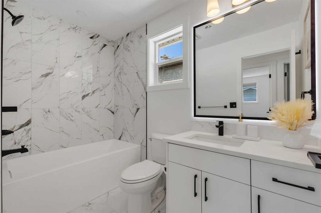 Upstairs, you’ll find three spacious bedrooms, including a primary with a generous closet. The main bathroom has been beautifully finished with a tub/shower combo with a full-height tiled surround and a backlit LED mirror, creating a spa-like feel in the everyday.