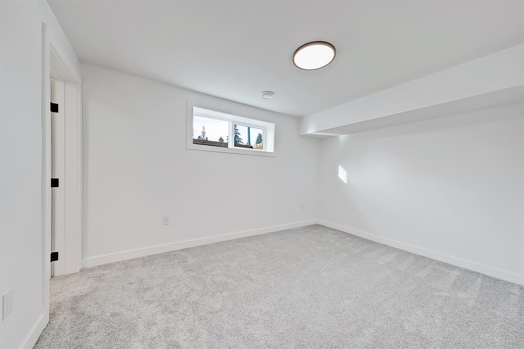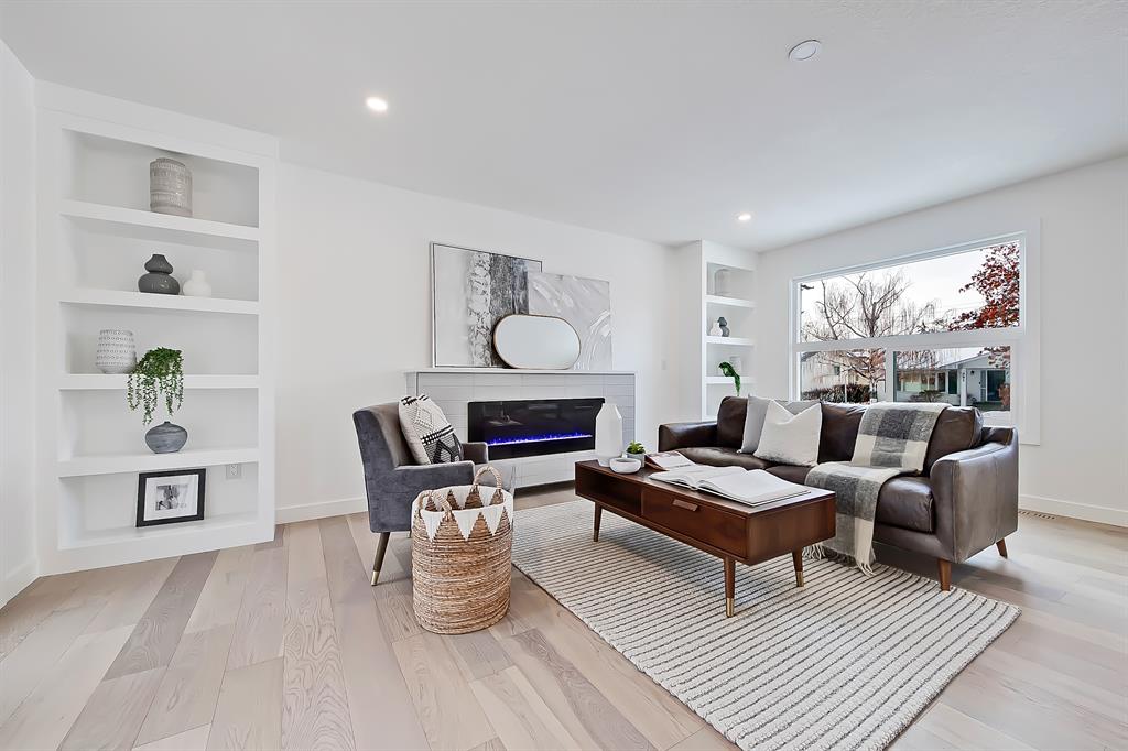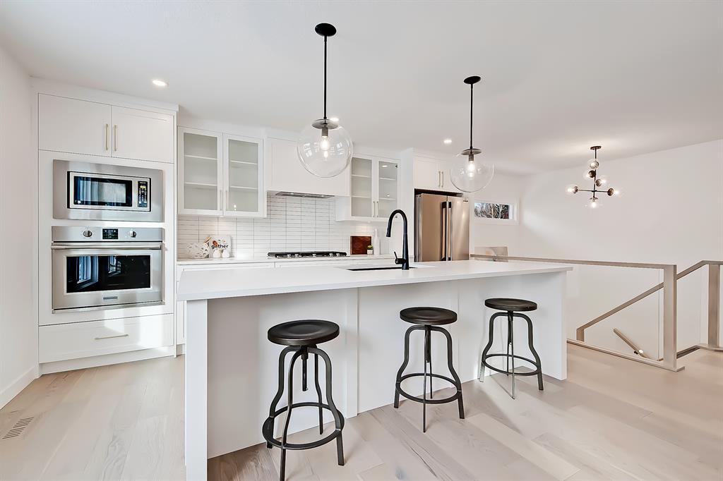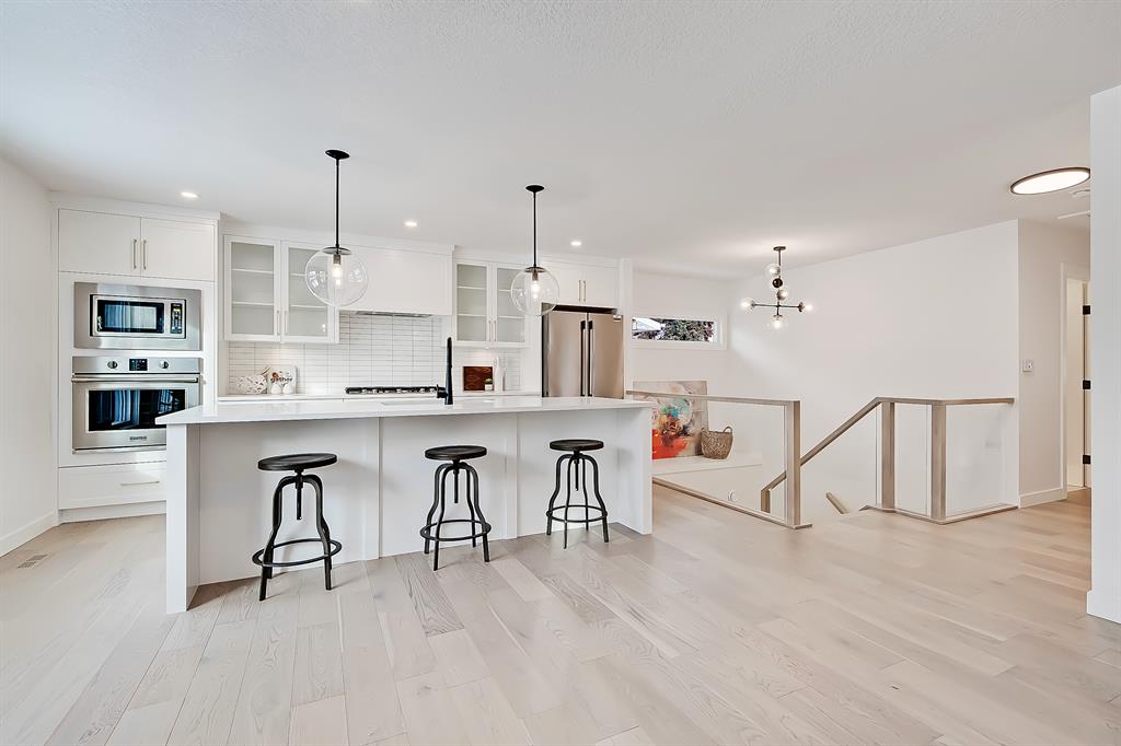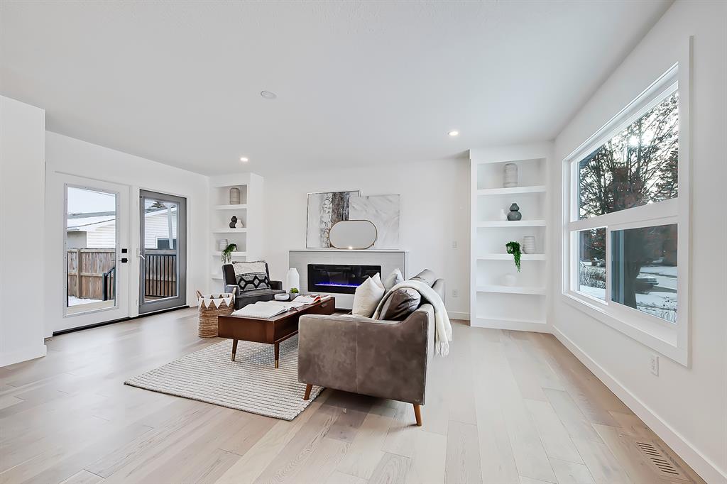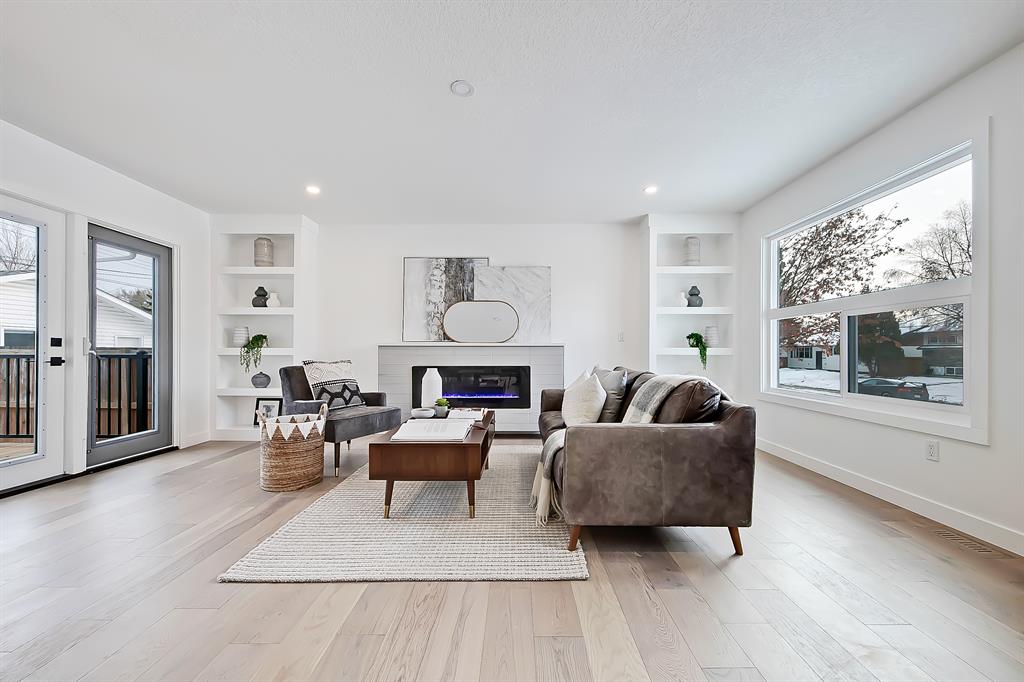 OPEN HOUSE SAT MAY 13 1:00-4:00 PM | Newly renovated bungalow in one of South Calgary’s best communities! This bright, contemporary home sits on a quiet street in picturesque Willow Park – moments from green spaces, Willow Park Golf & Country Club, Southcentre Mall, multiple schools, and endless shopping and amenities. Renovations include not only modern upgrades to the kitchen and overall living spaces but also an extension where the brand new living room sits AND a 10-ft x 10-ft deck addition! Other brand new additions include SMART home capabilities with new wiring, new plumbing, new lighting, new appliances, renovated bathrooms, new electric fireplace, and so much more! The modern finishes begin w/ the glass-panelled front door as you step into the spacious & bright living room featuring a built-in entertainment wall with an inset electric fireplace w/ a contemporary tile surround. Brand new oak engineered hardwood spans the main floor and leads you into the kitchen/dining room, where you’ll find shaker-style cabinetry, a classic white tile backsplash, lots of lower drawers, an oversized island w/ quartz countertops, & brand-new stainless steel appliances (including French door fridge, wall oven & microwave, gas cooktop, and custom-built hood fan). A dedicated dining space can hold an eight-person table and is perfect for entertaining. The large windows throughout bring in lots of natural light all day. Two bedrooms on the main floor feature incredible built-in storage, while the primary also features a tasteful feature wall and deluxe ensuite with a freestanding soaker tub, stand-up shower w/ full height tile, dual shower heads, BODY JETS and double vanity. The main bathroom also offers a quartz vanity and a tub/shower combo w/ full height tile surround. Down the GLASS stairwell, a large rec room enjoys its own built-in media wall and a full wet bar complete w/ sink, tile backsplash, beverage fridge, open display shelves with built in lighting, and lower cabinetry. There are also TWO good-sized bedrooms w/ easy access to the 4-pc bath w/tile surround.