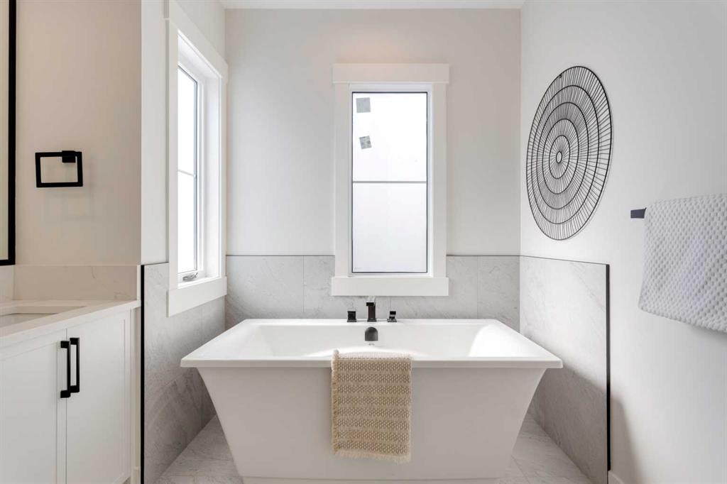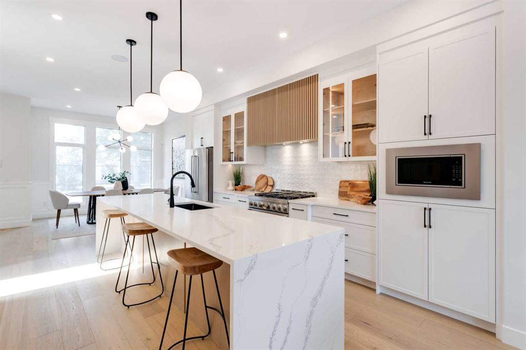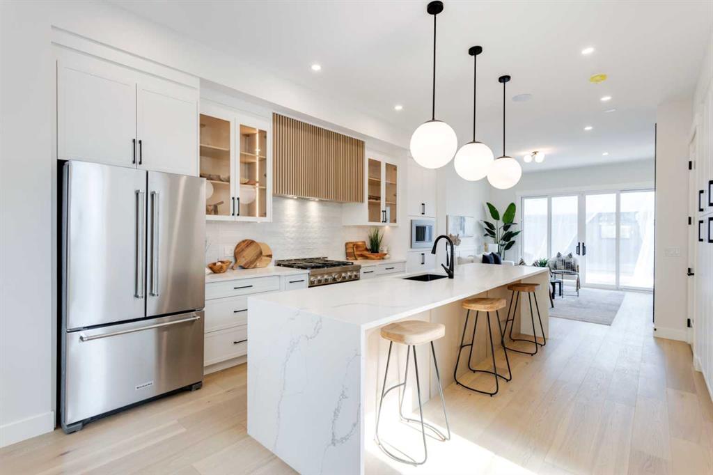 Step inside this modern semi-detached inner-city gem in sought-after RENFREW and discover a layout designed for both comfort and connection! With thoughtful upgrades and a smart, spacious flow, this home delivers a sense of ease the moment you walk through the front door. A spacious front foyer with a coat closet welcomes you home, with a spacious entrance before heading into the dedicated front dining room, which is built to host memorable family dinners. Engineered hardwood floors and 10-ft ceilings follow you into the heart of the home – an elegant central kitchen – that anchors the main level. With a generous island, built-in pantry, and upgraded appliances including a gas range and French door fridge/freezer, the space is as functional as it is beautiful. Just beyond, the living room invites you to relax by the fully tiled fireplace with custom built-ins and oversized windows that frame the backyard. Whether you’re enjoying a cozy evening in or entertaining a crowd, the open-concept layout brings everyone together without feeling crowded. Natural light fills the space throughout the day, and warm finishes add just the right amount of luxury. A discreet mudroom at the back offers built-in storage lockers for shoes, coats, and bags, keeping the chaos of everyday life out of sight. Tucked just off the mudroom is a stylish powder room for guests. From top to bottom, the main floor is planned with real-life functionality in mind without sacrificing design. Upstairs, the primary suite is a quiet retreat positioned at the front of the home. The large walk-in closet is well laid out, and the spa-inspired ensuite includes dual vanities, a freestanding soaker tub, and a tiled walk-in shower – perfect for unwinding at the end of the day. Two additional bedrooms at the back of the home are ideal for kids, guests, or a home office setup. A full 4-piece bathroom and a separate laundry room with built-in shelving and sink round out the upper floor. The lower level offers even more versatility, with a fully self-contained LEGAL 1-BEDROOM SUITE (subject to final City inspection). A private side entrance leads into a bright, open-concept layout featuring a modern kitchen with quartz countertops and bar seating, a spacious living area, in-suite laundry, a full bathroom, and a large bedroom with a walk-in closet. Generous windows let in natural light, making this an attractive option for rental income, in-laws, or extended family. Situated on a quiet, tree-lined street in Renfrew, this location checks all the boxes! You’re within walking distance to Renfrew Athletic Park, the community pool, tennis courts, and several highly rated local spots like Boogie’s Burgers, Diner Deluxe, and Blush Lane Market. Schools, playgrounds, transit, and downtown are all just minutes away, with Edmonton Trail just a short stroll away!