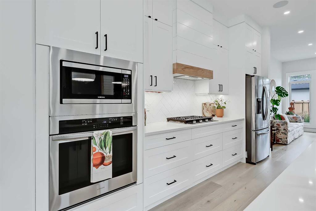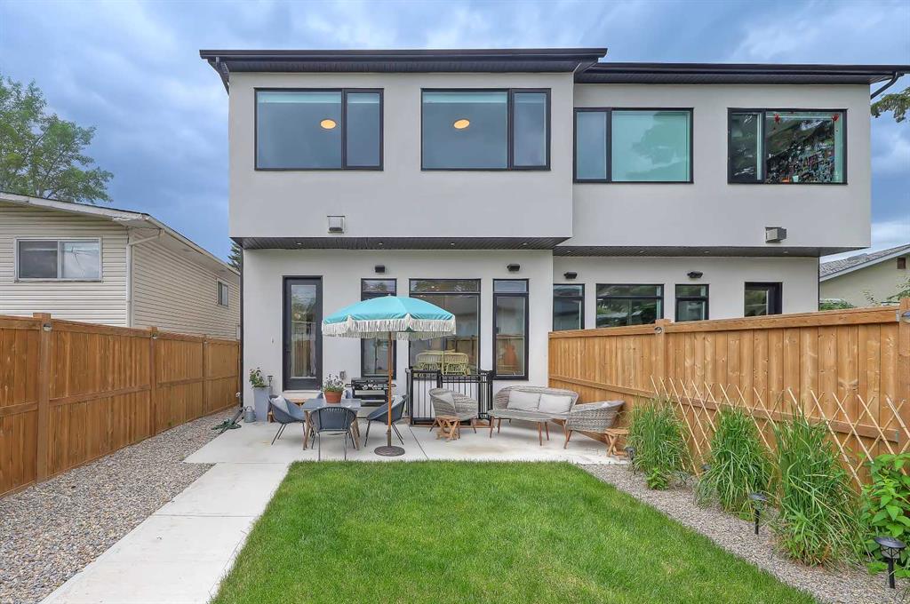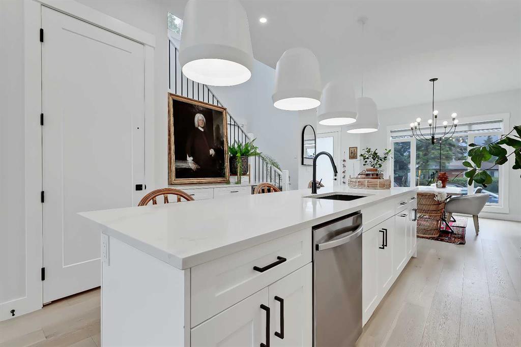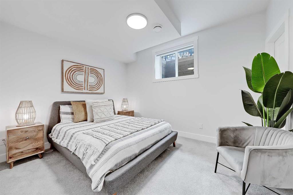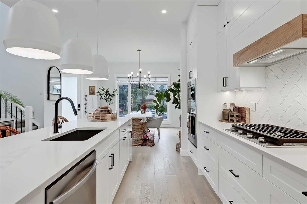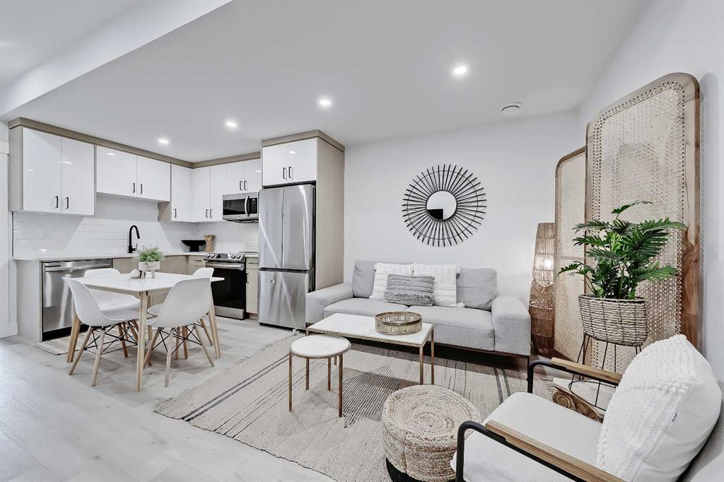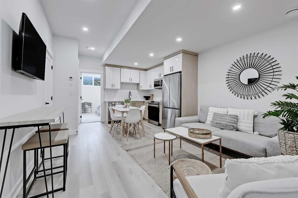 This semi-detached infill in BOWNESS will captivate you with its well thought-out layout and premium finishes, as well as its ideal inner-city location. This contemporary yet elegant home shows off w/ 10-ft painted ceilings on the main level, an upgraded kitchen, hardwood flooring on the main floor, expansive windows, and a 2-BED LEGAL LOWER SUITE. Located w/in walking distance to the Bow River and Bowness Park and a direct shot to downtown for an easy commute, this is the perfect home for families and professionals! At the front of the home, the bright formal dining room provides a view of the front yard and tons of space for a full-sized table, flowing seamlessly into the stunning kitchen upgraded w/ quartz countertops, custom shaker cabinetry w/under cabinet lighting, tons of lower drawers, and a beautiful herringbone tile backsplash. The oversized central island w/ bar seating and a-basin under-mount black granite sink w/ garburator make entertaining a breeze, along w/ the coffee station w/ a beverage fridge and shiplap wall. This stunning kitchen has a premium stainless steel appliance package, including a gas cooktop, custom hood fan, built-in wall oven and microwave, and dishwasher. The spacious living room features large West-facing windows overlooking the backyard and w/ an inset gas fireplace w/ white brick surround, mantle, feature wall, and display shelving. Discreetly tucked behind the main living area, a tiled mudroom offers a perfect entry space from the double detached garage w/ custom built-in storage and a bench, w/ access to the elegant powder room. Upstairs NEWLY INSTALLED CARPET helps showcase this space with two secondary bedrooms w/ built-in closets, a main 5-pc bath w/ dual vanity and fully tiled tub/shower combo, and a large laundry room. The beautiful primary suite features a vaulted ceiling, a large walk-in closet w/ built-in shelving and a bright window, and a luxurious 5-pc ensuite. The ensuite features tile floors, a glass shower w/ full-height surround, a free-standing tub, a modern vanity, dual under-mount sinks, and a separate water closet. An added benefit to this home is the 2-bed lower legal suite w/ a separate entrance w/ foyer, 9-ft ceilings, separate laundry, two good-sized bedrooms, and a main 4-pc bathroom w/ modern vanity w/ lots of storage and a fully tiled tub/shower combo. The central kitchen and living room space is eye-catching w/ two-tone cabinetry, tile backsplash, matte black hardware, and finished w/ a stainless-steel appliance package. This is an excellent space to use for extended family or as a legal rental property for a mortgage helper – previously rented fully furnished for $2100 a month! Other highlights of this already incredible home include dual furnaces, tankless hot water, ceiling speakers w/ three zones, rough-ins for central vacuum and a kick pan in the kitchen, and all window coverings included! All you have to do is move in!