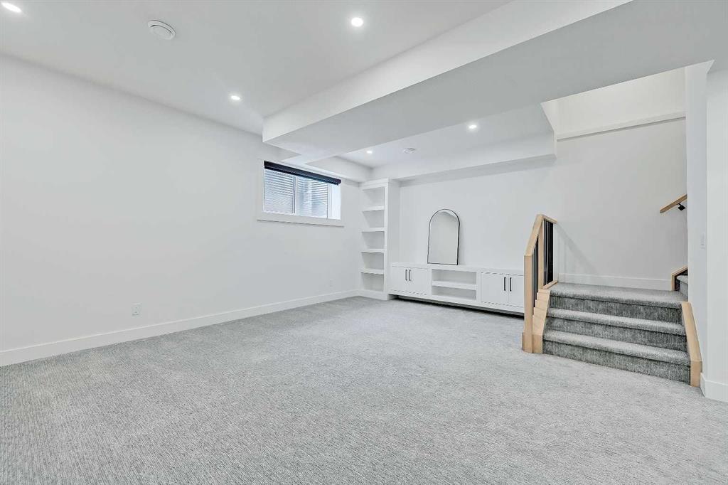 The lower level adds another dimension to the home. The expansive recreation room features a built-in media centre and open shelving, making it the perfect zone for movie nights, gaming, or relaxed gatherings. A sleek wet bar with a beverage fridge and sink elevates the space for entertaining, and an additional bedroom with a full bathroom provides comfort and privacy for guests. Ample storage keeps clutter tucked away, preserving a clean, open feel throughout.