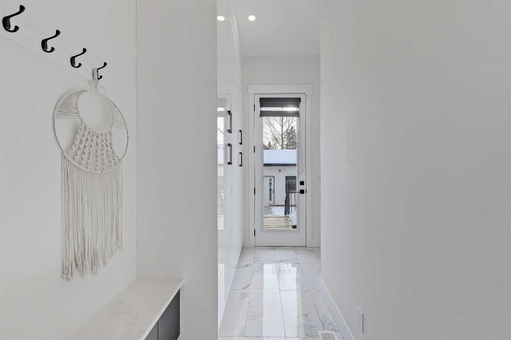 At the rear, a well-planned mudroom keeps life organized with built-ins for coats, bags, and sports gear, and the powder room offers a stylish touch for guests with modern finishes and a clean, elegant aesthetic.