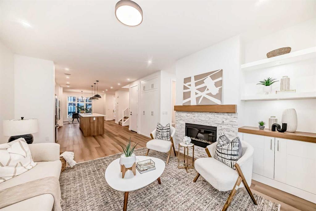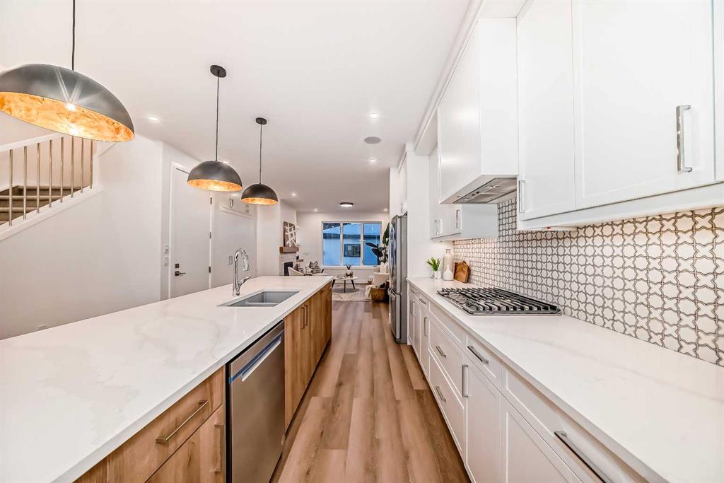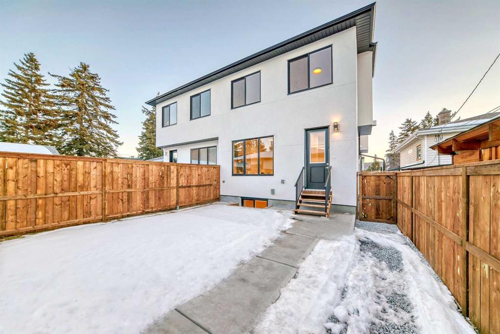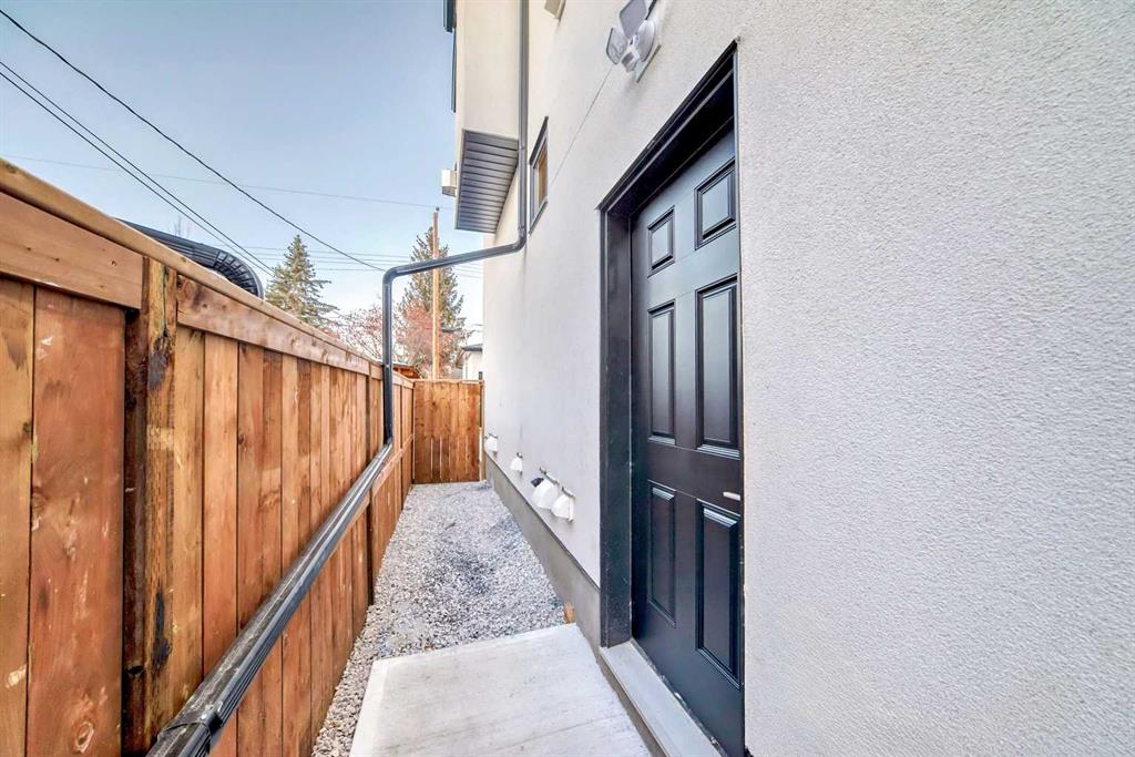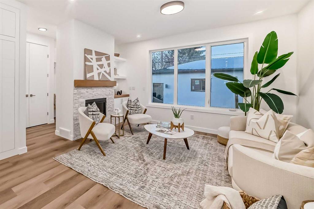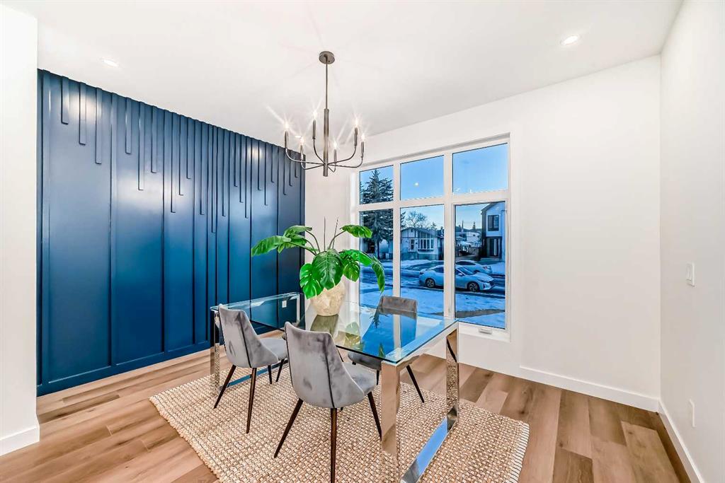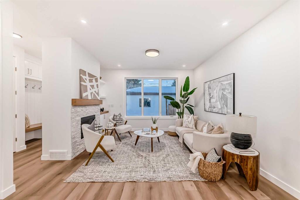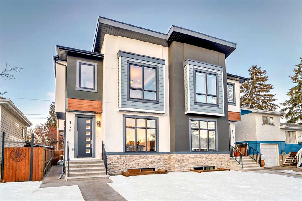 Discover the epitome of modern living in this beautifully designed semi-detached home located in the heart of vibrant Bowness! This meticulously crafted residence blends contemporary elegance with functional design, creating a perfect haven for family life and entertaining. Step into a bright and airy main floor featuring soaring ceilings, large windows, and an open-concept layout. A cozy dining space sits near the front foyer, illuminated by a statement feature wall, and flows seamlessly into the chef-inspired kitchen. The central focal point of this level, the kitchen features sleek ceiling-height custom cabinetry, a spacious waterfall island with quartz countertops, a star and cross designer tile backsplash, and high-end appliances that cater to culinary enthusiasts. Anchored by a stylish stone fireplace and surrounded by built-in shelving, the rear living room is perfect for gathering with loved ones or unwinding after a long day. A rear mudroom with a built-in bench and a private modern ensuite with designer tile flooring finish off the main floor perfectly. The upper level offers a private retreat with three spacious bedrooms, a modern main 4-pc bathroom, and a large laundry room with tile flooring and a sink. The luxurious primary suite exudes tranquillity, complete with a tray ceiling, a generous walk-in closet, and an opulent ensuite. Enjoy a spa-like experience with a freestanding tub, an oversized glass-enclosed shower with full-height tile surround, and dual vanities. Two additional bedrooms are well-equipped, with ample closet space, and share a thoughtfully designed bathroom. The fully developed basement expands the living space, featuring a LEGAL 2-BED LOWER SUITE (subject to permits & approvals by the city), for an excellent mother-in-law suite or a mortgage helper. The modern elegance continues into this space, which enjoys a private entrance, a dedicated laundry space, 2 good-sized bedrooms, and a modern 4-pc bathroom. The kitchen and living area will suit your needs perfectly, with custom oak ceiling-height cabinetry, luxury vinyl plank flooring, a subway tile backsplash, and a beautiful quartz countertop. This home is as functional as it is beautiful, offering a detached double garage, a private deck, and a professionally landscaped yard to enjoy. Situated in the charming community of Bowness, this property offers easy access to schools, parks, and the Bow River pathways. Walk to local coffee shops, explore nearby restaurants, or take a short drive to downtown Calgary. With its thoughtful design and unbeatable location, this home offers an unparalleled lifestyle opportunity. Don’t miss your chance to make this stunning property your new home – schedule your viewing today!