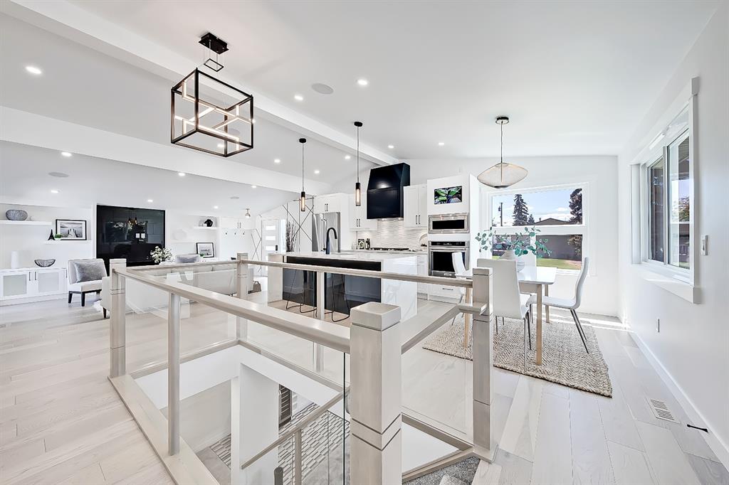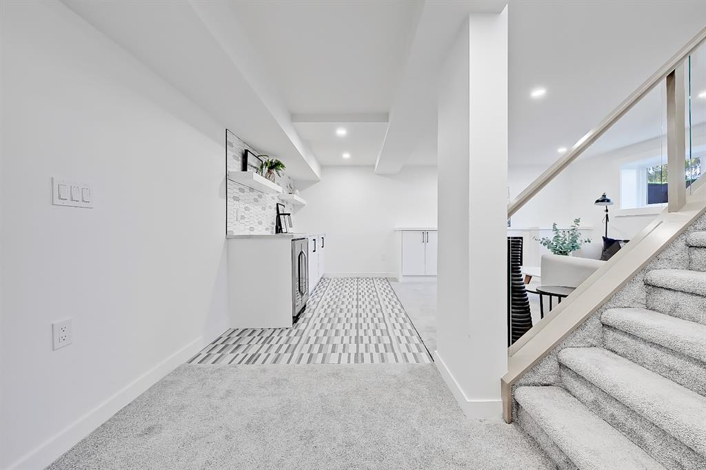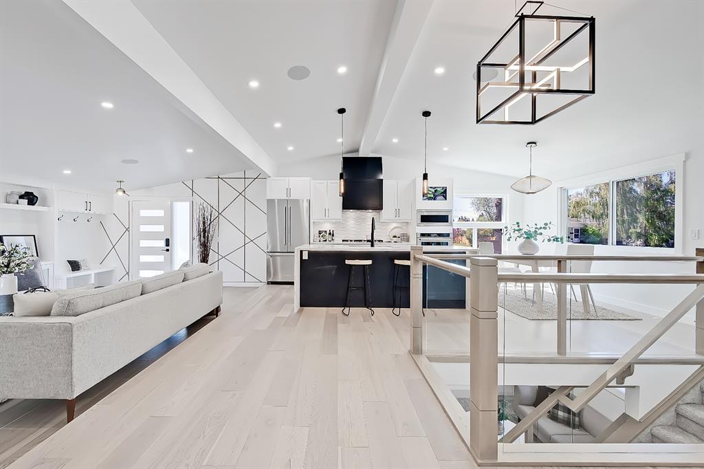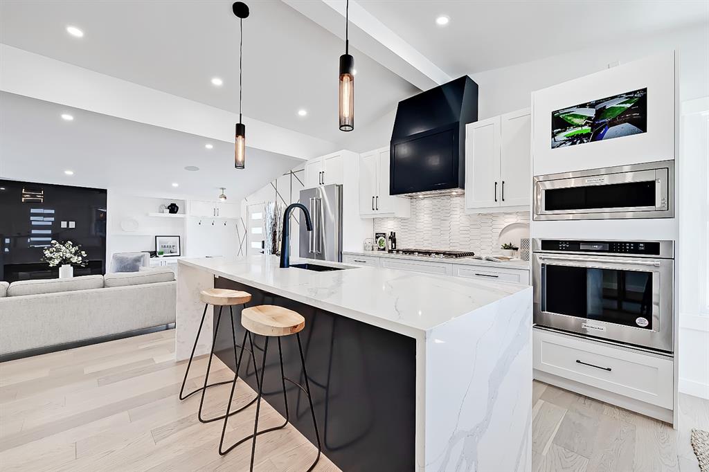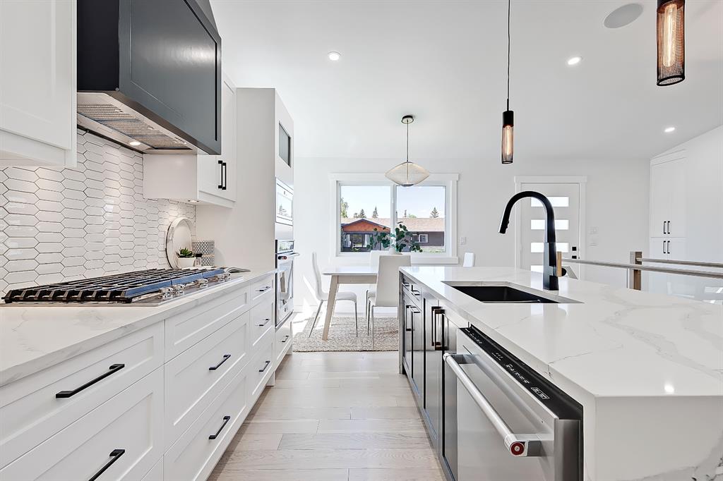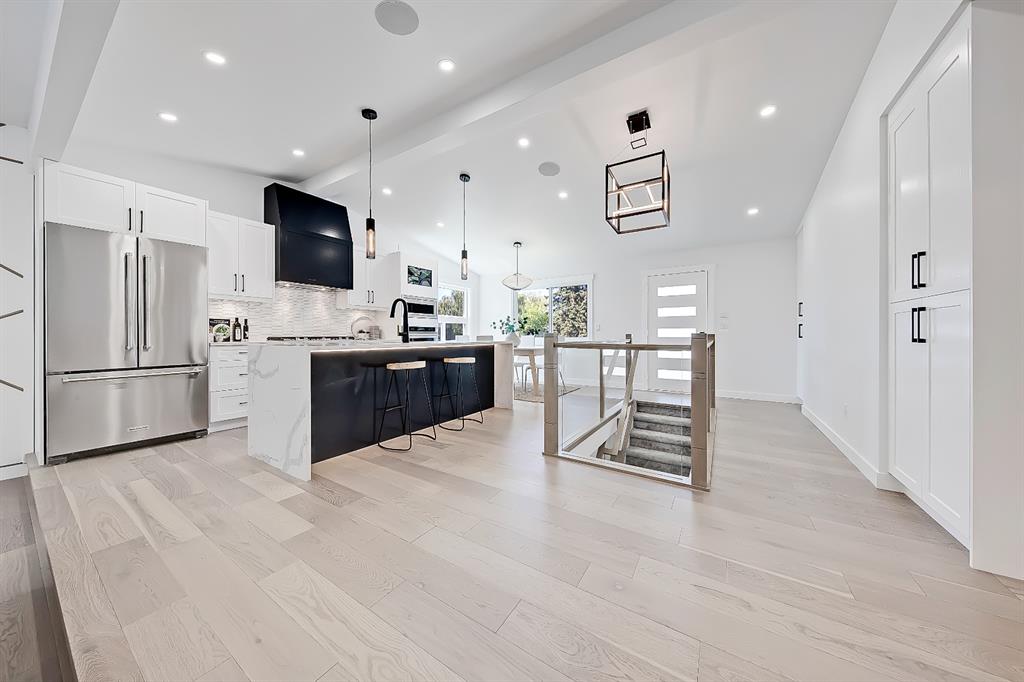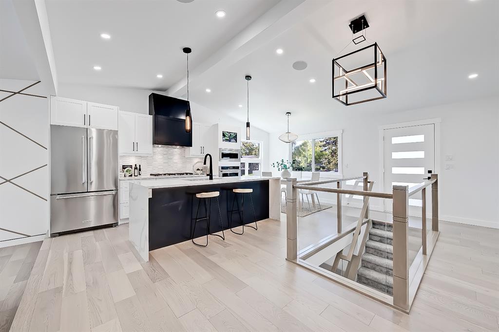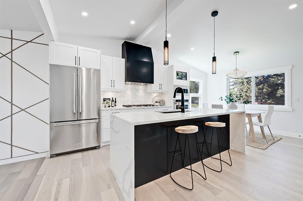 You absolutely need to see this EXTENSIVELY RENOVATED BUNGALOW w/ RV PARKING in the established community of ACADIA! You’d never know this home was originally built in 1962 w/ all the MODERN & NEW touches – including SMART home capabilities w/ 200-AMP service & wiring, new plumbing, new lighting, new appliances, renovated bathrooms, updated flooring, new electric fireplaces…& so much more. The modern elegance begins w/ the glass-panelled front door as you step into the spacious & bright living room. The contemporary living room features a vaulted ceiling w/ a built-in entertainment wall, a geometric feature wall, & an inset electric fireplace w/ a full-height tile surround. Brand new oak engineered hardwood spans the living room & into the raised open kitchen. The vaulted ceiling also continues into the kitchen/dining room, where you’ll find shaker-style cabinetry, a classic white tile backsplash, lots of lower drawers, an oversized two-tone island w/ waterfall quartz countertops, & brand-new KitchenAid stainless steel appliances (including French door fridge, wall oven & microwave, gas cooktop, & custom-built hood fan). A dedicated dining space can hold a six-person table & sits next to two large windows for natural light all day. Two bedrooms on the main floor feature incredible built-in storage, while the primary also features a tasteful feature wall & deluxe ensuite w/ WIFI CONTROLLED IN-FLOOR HEAT, a freestanding soaker tub, stand-up shower w/ full height tile, & dual vanity. A full laundry room is also located outside the bedrooms w/ a tile backsplash, SINK, folding counter, & built-in storage. The main bathroom also offers IN-FLOOR HEAT & anti-stain tiles! Down the GLASS stairwell, a large rec room enjoys its own BUILT-IN MEDIA wall centring on an electric fireplace surrounded by built-in cabinetry & a full WET BAR complete w/ sink, tile backsplash, beverage fridge, open display shelves, & lower cabinetry w/ wine racks. There are also TWO good-sized bedrooms w/ easy access to the 4-pc bath w/ a large standing shower w/ tile surround & a flex space perfect for a home GYM or OFFICE. Out back, not only will you enjoy the fully fenced & landscaped yard w/ a brand-new vinyl deck, but there’s also a newly built INSULATED & DRYWALLED OVERSIZED 22×24 double detached garage w/ an 18×8 overhead door & the 200 Amp supply makes it easy to install an EV Charging Station. RV PARKING w/ secured fence access means no more storage fees! Acadia offers a quiet, friendly neighbourhood to relax & unwind in, perfect for retirees or those raising a family. Mature trees & big lots line the streets, w/ many schools & parks making up the neighbourhood. Sue Higgins Off-Leash Park is just down the road, just across the river from Carburn Park, & the community is surrounded by Heritage Dr, Southland Drive, Macleod, & Blackfoot Trail to take you anywhere in the city you want to go! It’s truly a fantastic location to settle down in.
